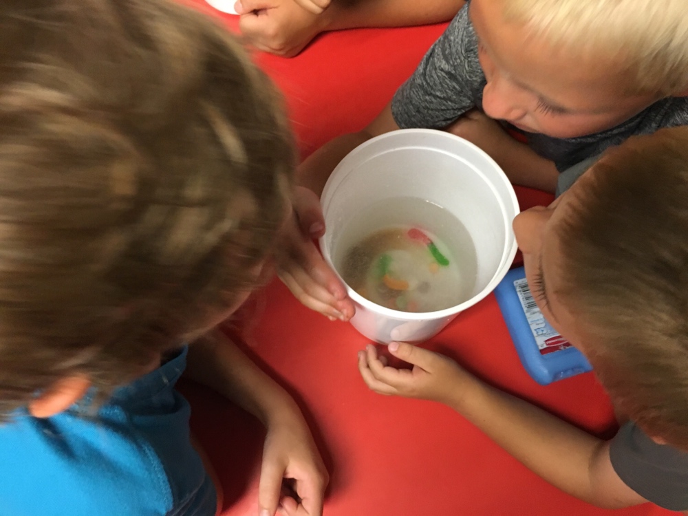 | Our young scientists are watching gummy worms in hot water to see what happens. |